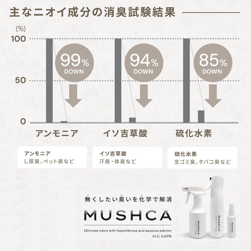 MUSHCA(ムシュカ)ミニは、「香りも成分も残さずニオイを消す」ことで無臭化を目指す、新感覚の消臭スプレー。