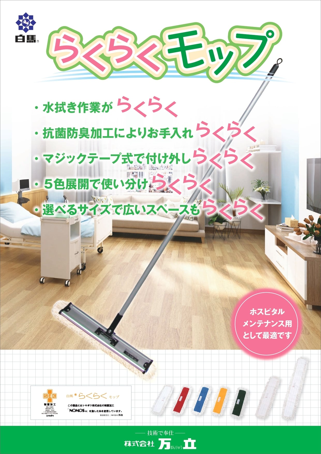 らくらくモップは、「女性や年配スタッフでも、重労働の水拭きをラクにできるモップをつくりたい」という想いから生まれました。