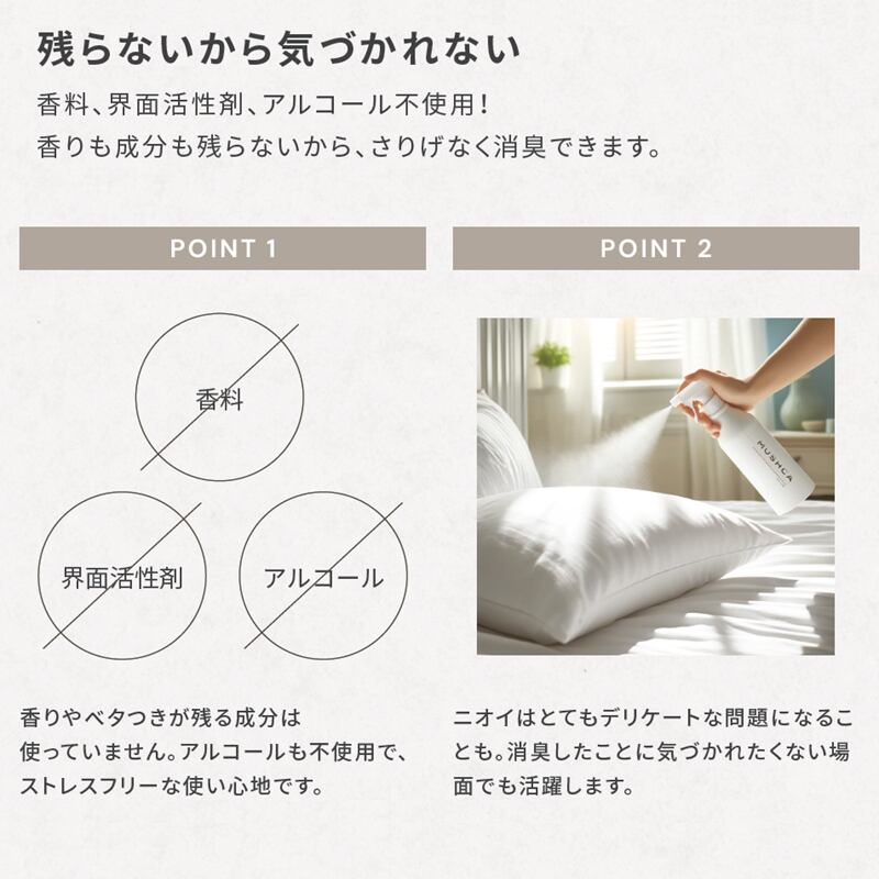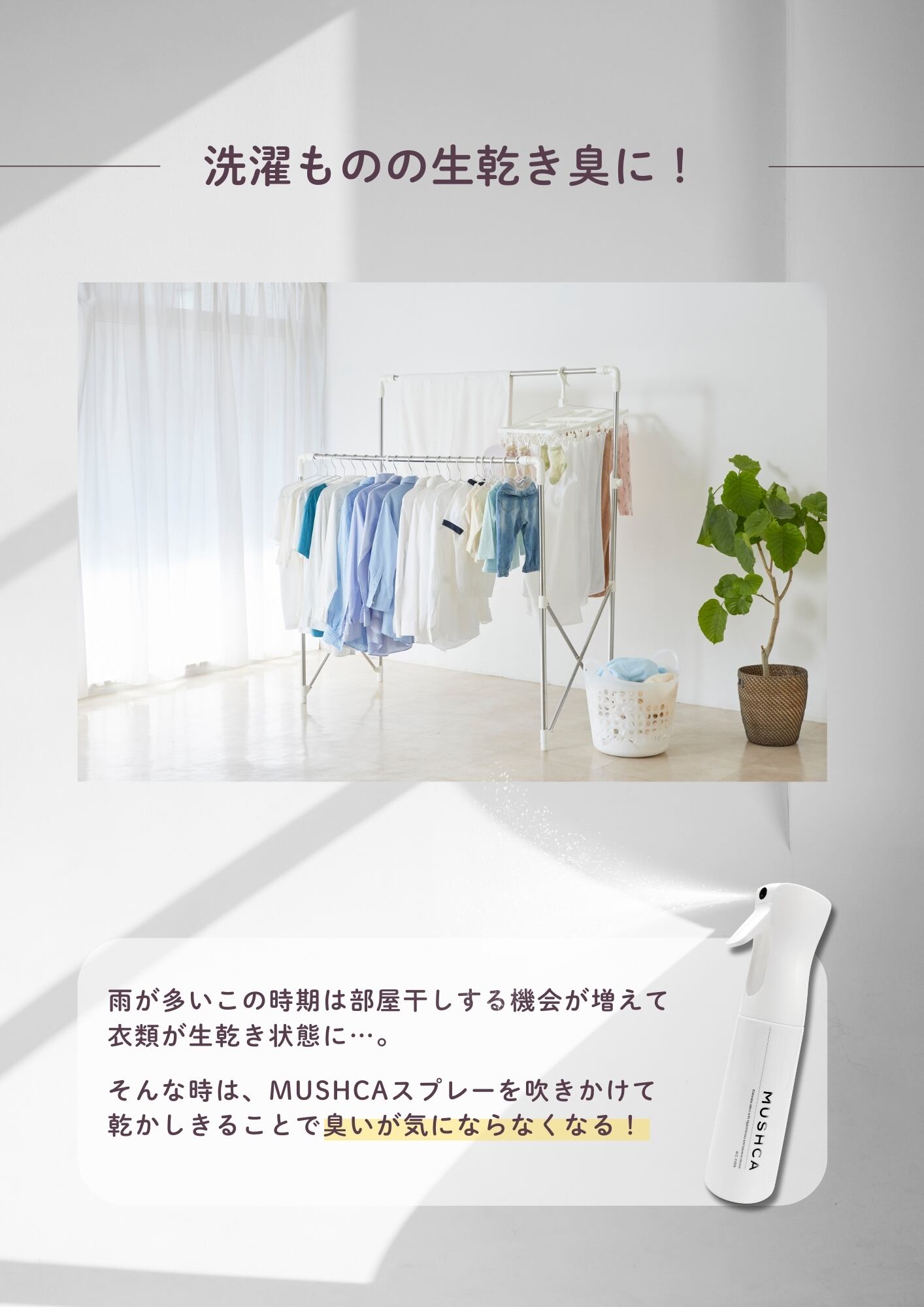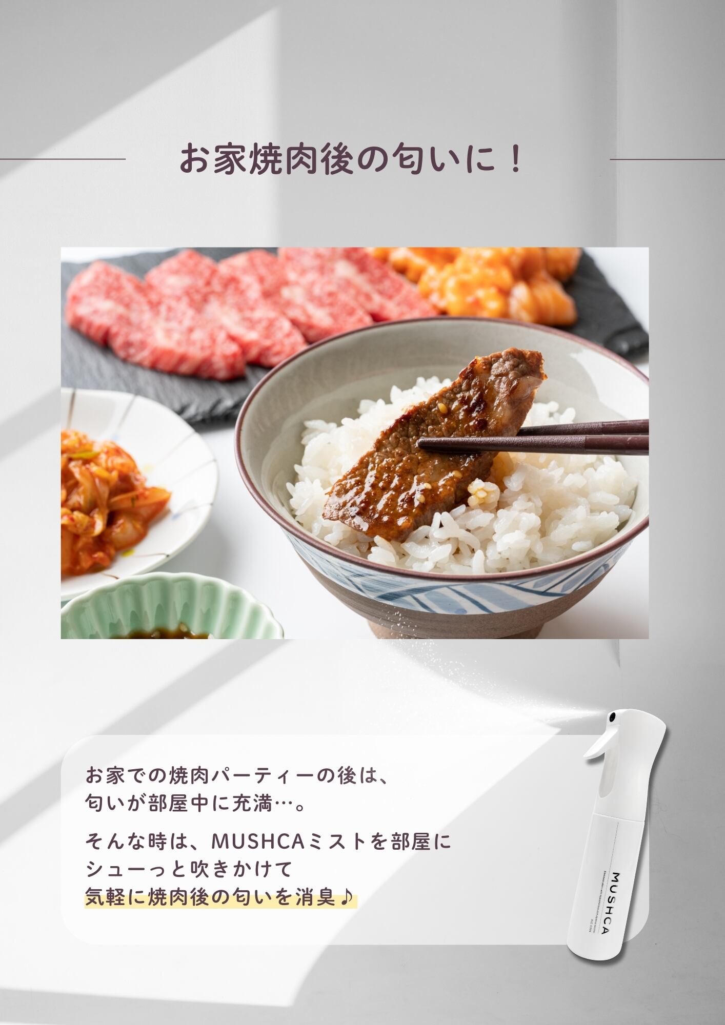 MUSHCA(ムシュカ)は、「香りも成分も残さずニオイを消す」ことで無臭化を目指す、新感覚の消臭スプレー。